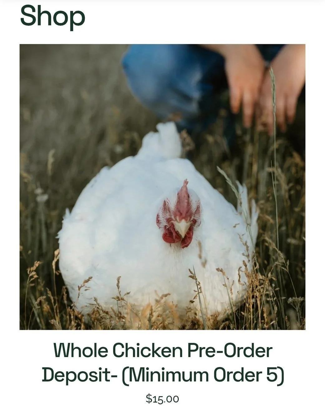 Pasture-raised chickens are available for pre-sale in mid-January. Chickens must be purchased before they are processed in mid-July.